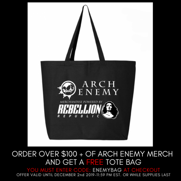 It's your favorite time of the year again! ? Get 15% off all Arch Enemy merch at Rebellion Republic - only valid until Dec. 2, 2019! NO CODE NEEDED. Discounts will appear in the checkout screen automatically. PLUS, if you order over $100, you'll get a free, LIMITED Arch Enemy tote bag FOR FREE (while supplies last: enter "ENEMYBAG" at the checkout)!