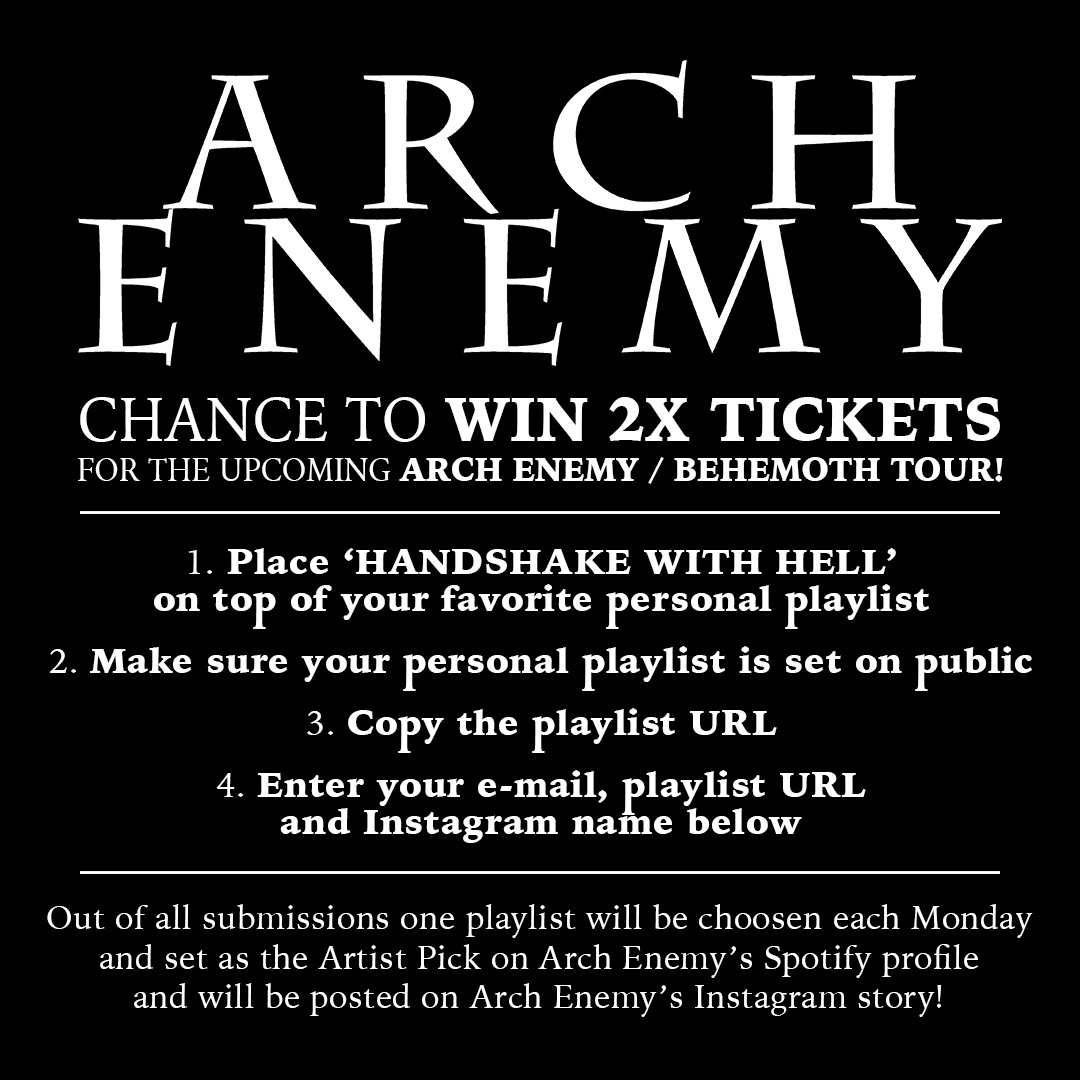 after all the great feedback to our current single "Handshake With Hell" we set up a contest where you have the chance to win 2x tickets for our upcoming US or EU tour (festivals not included), plus the unique opportunity to have your personal playlist set as artist pick for one week on our official Spotify channel.